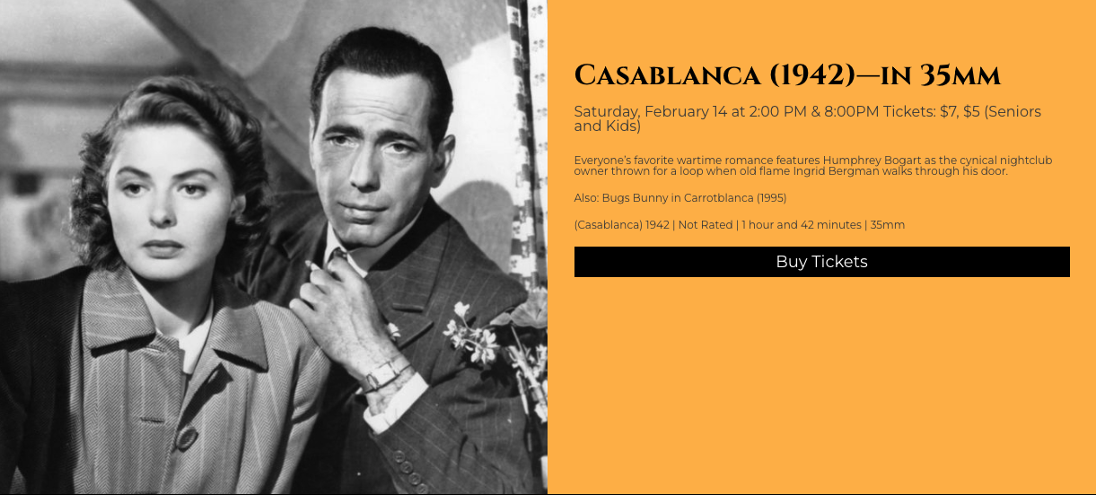 In Detroit, Michigan The Redford Theatre will present Casablanca (1942, a 35mm print) on Saturday, February 14.
