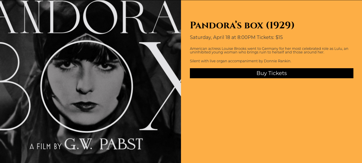 In Detroit, Michigan The Redford Theatre will present Pandora’s Box (1929, with live organ accompaniment by Donnie Rankin) on Saturday, April 18.